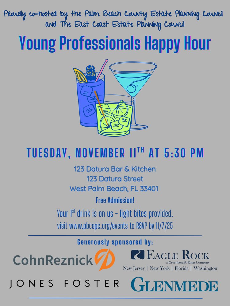 Please join the Young Professionals of The East Coast Estate Planning Council and the Palm Beach County Estate Planning Council for a networking happy hour! All members and non-members under 40, or in their first 5 years of practice, are invited to attend. We encourage members to extend the invitation to colleagues and friends who meet the "young professional" criteria. Free admission. Your 1st drink is on us. Light bites provided. Please register by Friday, November 7th to reserve your spot. Click HERE to RSVP!